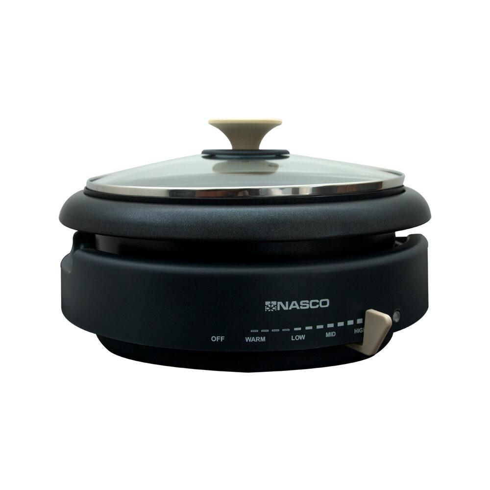 This electric hot pot features an adjustable temperature control system that allows precise heat management for different cooking requirements, from gentle simmering to rapid boiling. The unit includes a non-stick interior coating that ensures easy food release and straightforward cleaning after use. The Nasco NAS-SC1200AB incorporates a transparent glass lid that enables monitoring of cooking progress without heat loss, along with cool-touch handles for safe handling during operation. Its versatile functionality and substantial capacity make it suitable for preparing soups, noodles, rice, vegetables, and various one-pot meals while serving as a space-efficient alternative to traditional cooking appliances.